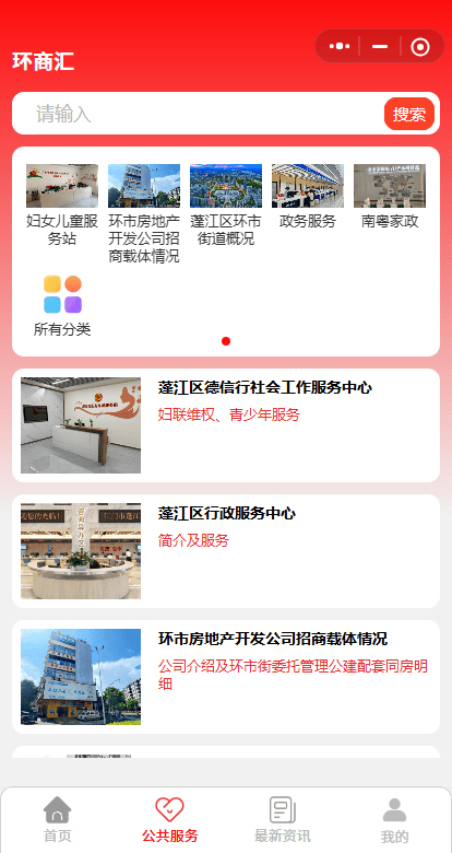 除核心商业服务外,“环商汇”小程序突破传统服务边界,创新增设公共服务和最新资讯两大特色板块。其中,公共服务板块接入蓬江区行政服务中心、南粤家政、一门式服务等便民资源,服务范围辐射全体市民,为群众办事提供了更多便利;最新资讯板块实时推送商会动态与街道资讯,全程跟进播报环市街道重大活动,让政务信息传递更及时、更鲜活。